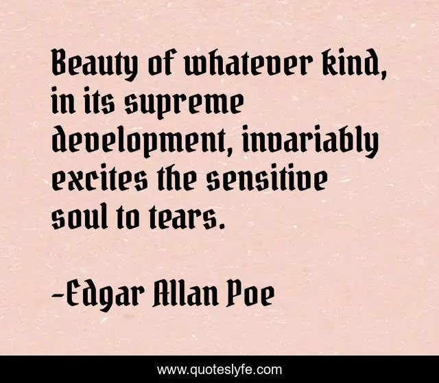 This page presents the quote "Beauty of whatever kind, in its supreme development, invariably excites the sensitive soul to tears.". Author of this quote is Edgar Allan Poe. This quote is about sensitive, tears, soul, beauty,.
