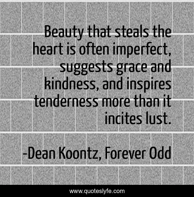 This page presents the quote "Beauty that steals the heart is often imperfect, suggests grace and kindness, and inspires tenderness more than it incites lust.". Author of this quote is Dean Koontz, Forever Odd. This quote is about lust, tenderness, kindness, beauty, odd-thomas,.