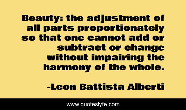 This page presents the quote "Beauty: the adjustment of all parts proportionately so that one cannot add or subtract or change without impairing the harmony of the whole.". Author of this quote is Leon Battista Alberti. This quote is about without, harmony, change,.