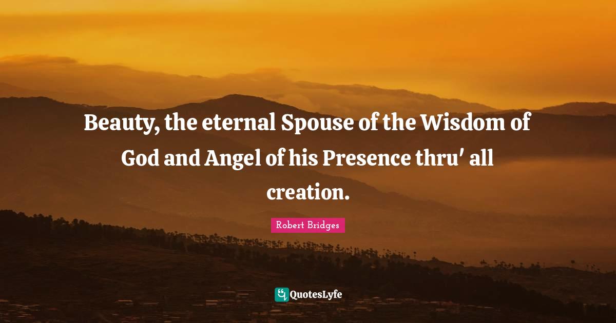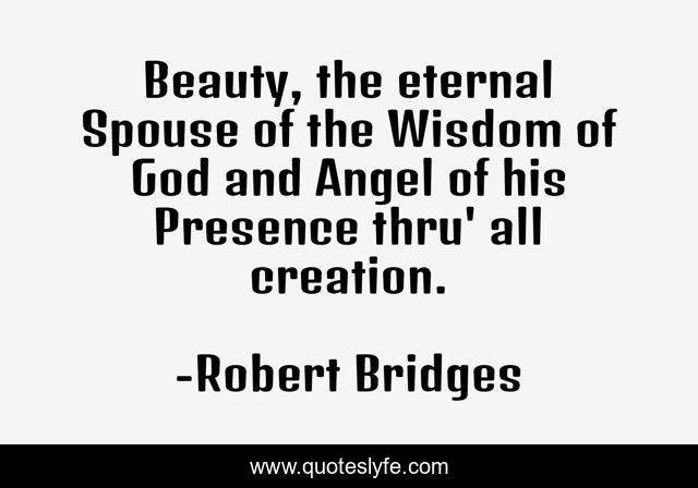 This page presents the quote "Beauty, the eternal Spouse of the Wisdom of God and Angel of his Presence thru' all creation.". Author of this quote is Robert Bridges. This quote is about god, angel, wisdom,.