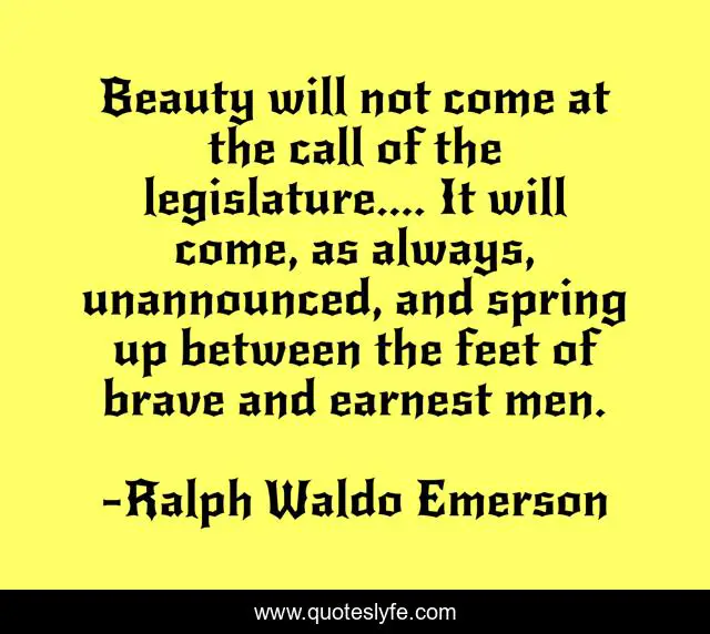 This page presents the quote "Beauty will not come at the call of the legislature.... It will come, as always, unannounced, and spring up between the feet of brave and earnest men.". Author of this quote is Ralph Waldo Emerson. .
