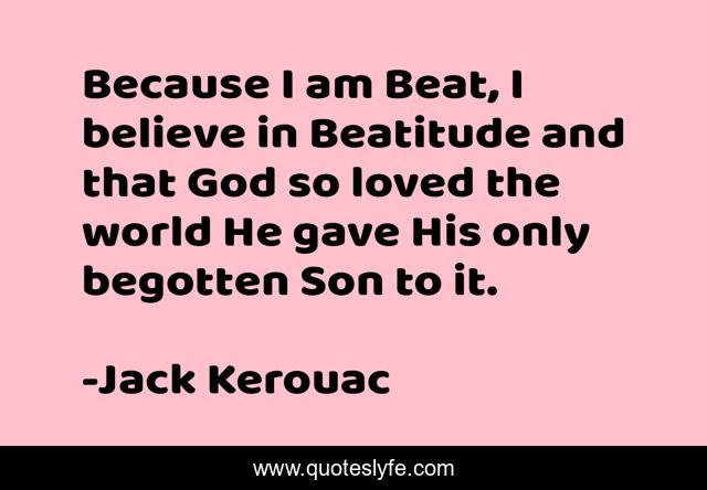 This page presents the quote "Because I am Beat, I believe in Beatitude and that God so loved the world He gave His only begotten Son to it.". Author of this quote is Jack Kerouac. This quote is about beat, catholicism, faith, beatitude, god,.