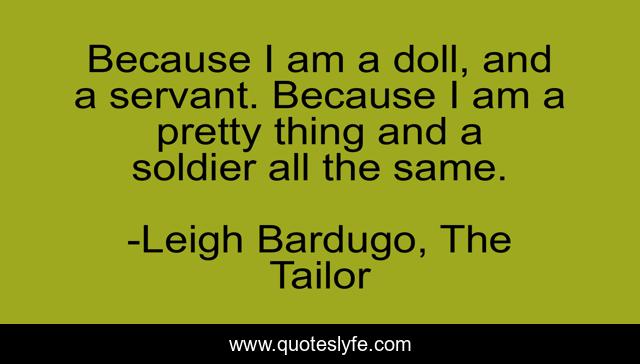 This page presents the quote "Because I am a doll, and a servant. Because I am a pretty thing and a soldier all the same.". Author of this quote is Leigh Bardugo, The Tailor. .