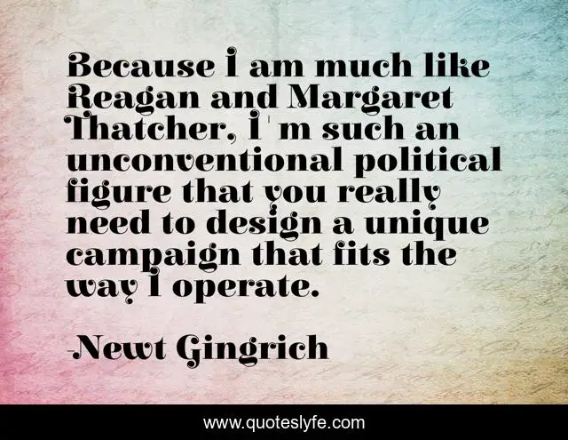 This page presents the quote "Because I am much like Reagan and Margaret Thatcher, I'm such an unconventional political figure that you really need to design a unique campaign that fits the way I operate.". Author of this quote is Newt Gingrich. This quote is about unique, political,.