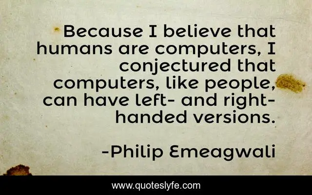 This page presents the quote "Because I believe that humans are computers, I conjectured that computers, like people, can have left- and right-handed versions.". Author of this quote is Philip Emeagwali. This quote is about i believe, believe, people,.