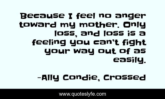 This page presents the quote "Because I feel no anger toward my mother. Only loss, and loss is a feeling you can’t fight your way out of as easily.". Author of this quote is Ally Condie, Crossed. This quote is about feel, loss, fight,.