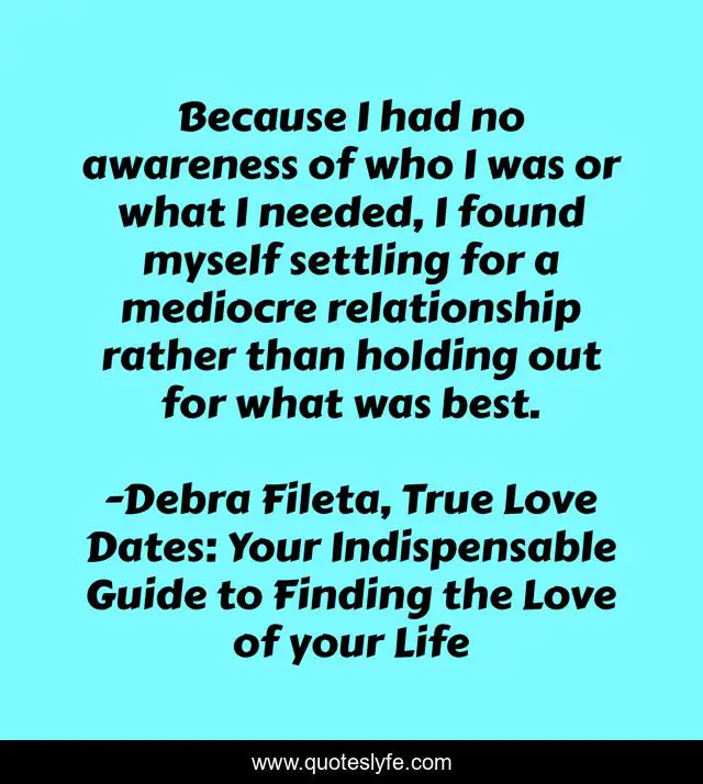This page presents the quote "Because I had no awareness of who I was or what I needed, I found myself settling for a mediocre relationship rather than holding out for what was best.". Author of this quote is Debra Fileta, True Love Dates: Your Indispensable Guide to Finding the Love of your Life. This quote is about dating, christian-dating,.