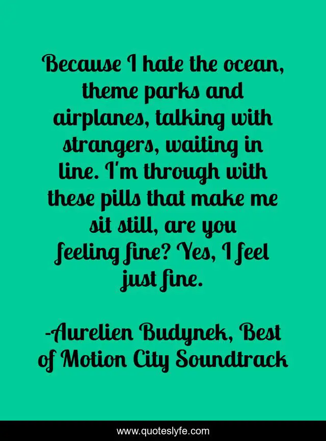 This page presents the quote "Because I hate the ocean, theme parks and airplanes, talking with strangers, waiting in line. I'm through with these pills that make me sit still, are you feeling fine? Yes, I feel just fine.". Author of this quote is Aurelien Budynek, Best of Motion City Soundtrack. This quote is about love, amazing, music, affection, motion-city-soundtrack,.