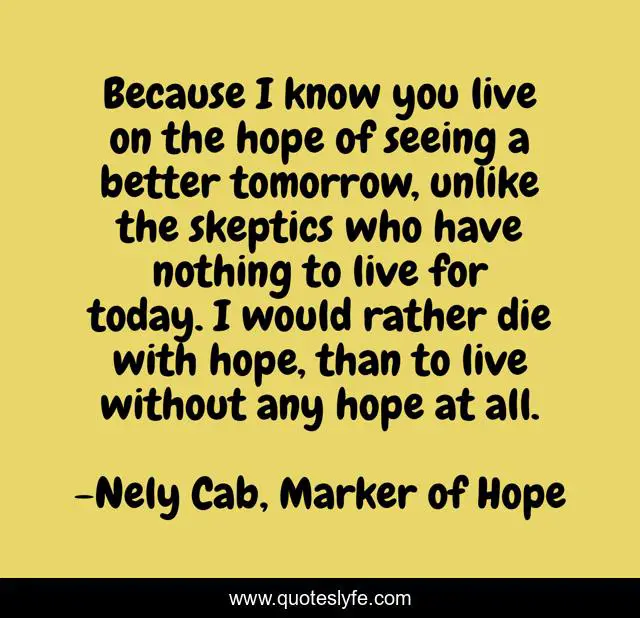 This page presents the quote "Because I know you live on the hope of seeing a better tomorrow, unlike the skeptics who have nothing to live for today. I would rather die with hope, than to live without any hope at all.". Author of this quote is Nely Cab, Marker of Hope. This quote is about romance, fantasy, creatura, ya, mythology,.