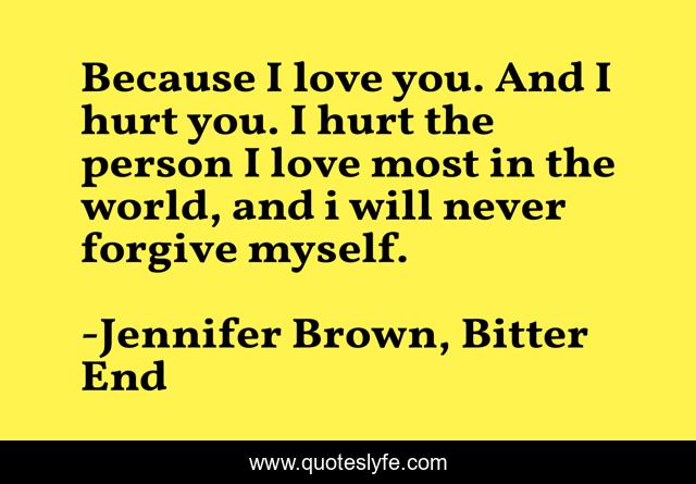 This page presents the quote "Because I love you. And I hurt you. I hurt the person I love most in the world, and i will never forgive myself.". Author of this quote is Jennifer Brown, Bitter End. This quote is about alex, hurt, abuse, love, cole, affection,.