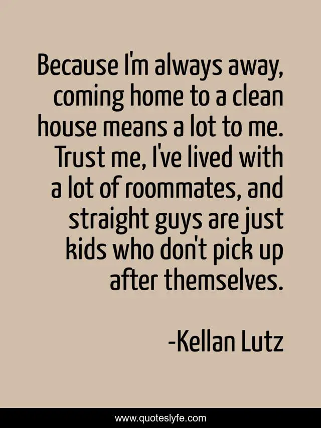 This page presents the quote "Because I'm always away, coming home to a clean house means a lot to me. Trust me, I've lived with a lot of roommates, and straight guys are just kids who don't pick up after themselves.". Author of this quote is Kellan Lutz. This quote is about me, home, kids,.