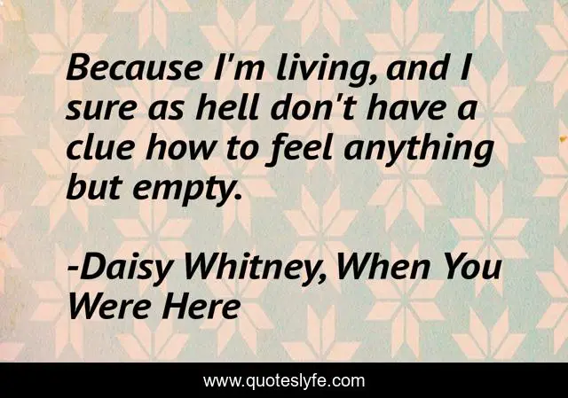 This page presents the quote "Because I'm living, and I sure as hell don't have a clue how to feel anything but empty.". Author of this quote is Daisy Whitney, When You Were Here. This quote is about living, life, feeling, emptiness,.