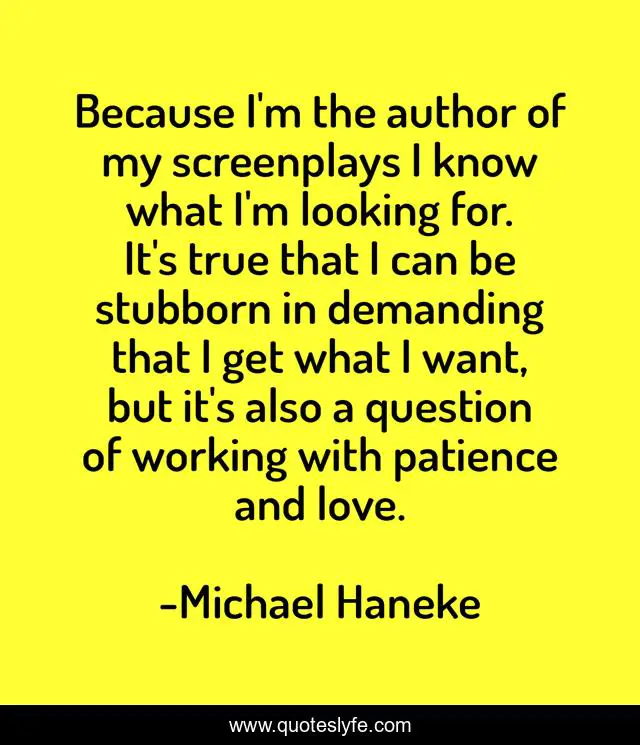 This page presents the quote "Because I'm the author of my screenplays I know what I'm looking for. It's true that I can be stubborn in demanding that I get what I want, but it's also a question of working with patience and love.". Author of this quote is Michael Haneke. This quote is about looking, love, affection,.