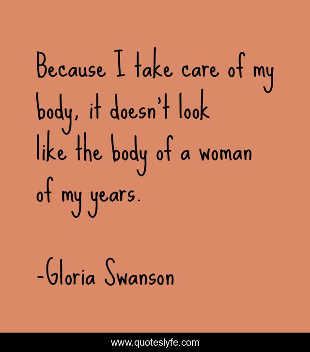 This page presents the quote "Because I take care of my body, it doesn't look like the body of a woman of my years.". Author of this quote is Gloria Swanson. This quote is about body, woman, care,.