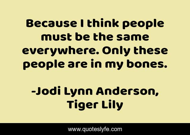 This page presents the quote "Because I think people must be the same everywhere. Only these people are in my bones.". Author of this quote is Jodi Lynn Anderson, Tiger Lily. This quote is about home, homesickness, peter-pan, family,.