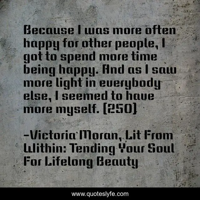 This page presents the quote "Because I was more often happy for other people, I got to spend more time being happy. And as I saw more light in everybody else, I seemed to have more myself. (250)". Author of this quote is Victoria Moran, Lit From Within: Tending Your Soul For Lifelong Beauty. This quote is about light, sharing, happiness, reciprocity, others,.
