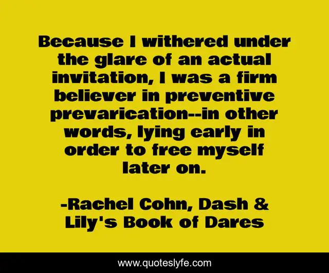 This page presents the quote "Because I withered under the glare of an actual invitation, I was a firm believer in preventive prevarication--in other words, lying early in order to free myself later on.". Author of this quote is Rachel Cohn, Dash & Lily's Book of Dares. This quote is about humor, lying,.