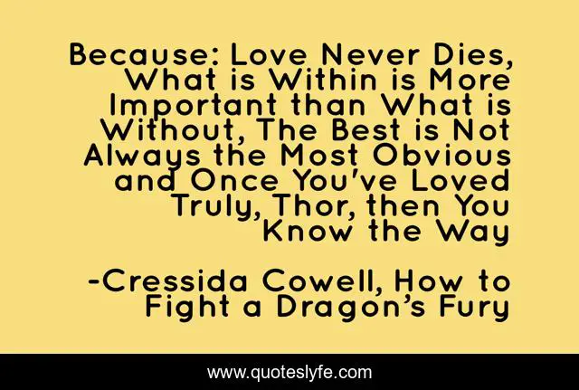 This page presents the quote "Because: Love Never Dies, What is Within is More Important than What is Without, The Best is Not Always the Most Obvious and Once You've Loved Truly, Thor, then You Know the Way". Author of this quote is Cressida Cowell, How to Fight a Dragon’s Fury. This quote is about emotional, cowell, cressida, inspirational, enthusiasm,.