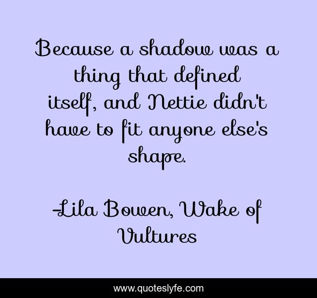 This page presents the quote "Because a shadow was a thing that defined itself, and Nettie didn't have to fit anyone else's shape.". Author of this quote is Lila Bowen, Wake of Vultures. This quote is about diversity, self-esteem,.