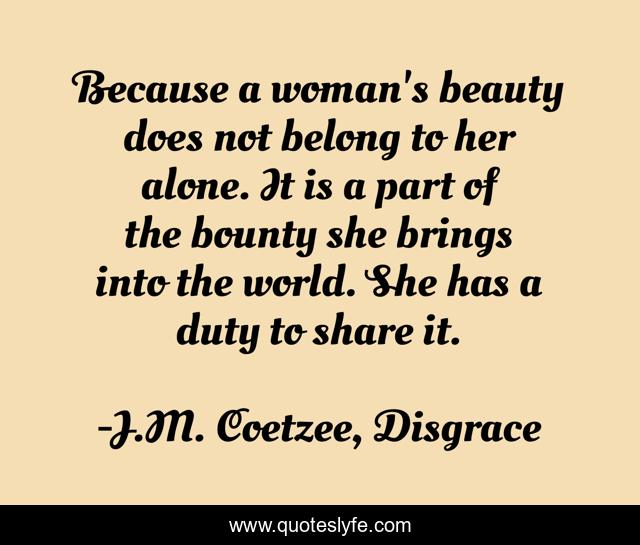 This page presents the quote "Because a woman's beauty does not belong to her alone. It is a part of the bounty she brings into the world. She has a duty to share it.". Author of this quote is J.M. Coetzee, Disgrace. .