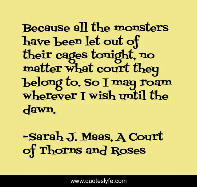 This page presents the quote "Because all the monsters have been let out of their cages tonight, no matter what court they belong to. So I may roam wherever I wish until the dawn.". Author of this quote is Sarah J. Maas, A Court of Thorns and Roses. This quote is about high-lord, night-court, rhysand, freyre, high-fae, cage, monsters, rhys, fae,.
