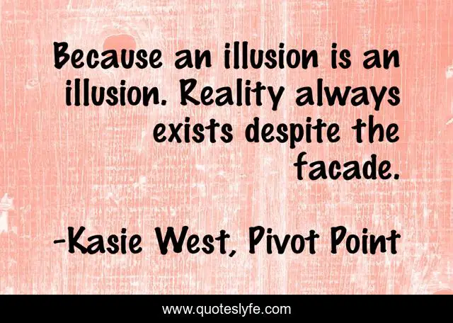 This page presents the quote "Because an illusion is an illusion. Reality always exists despite the facade.". Author of this quote is Kasie West, Pivot Point. This quote is about illusion, reality,.