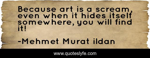 This page presents the quote "Because art is a scream, even when it hides itself somewhere, you will find it!". Author of this quote is Mehmet Murat ildan. This quote is about turkish-aphorisms, art, mehmet-murat-ildan, ildan-wise-sayings, turkish, ildan-wisdom, turkish-sayings, turkish-playwrights, turkish-wisdom-words,.