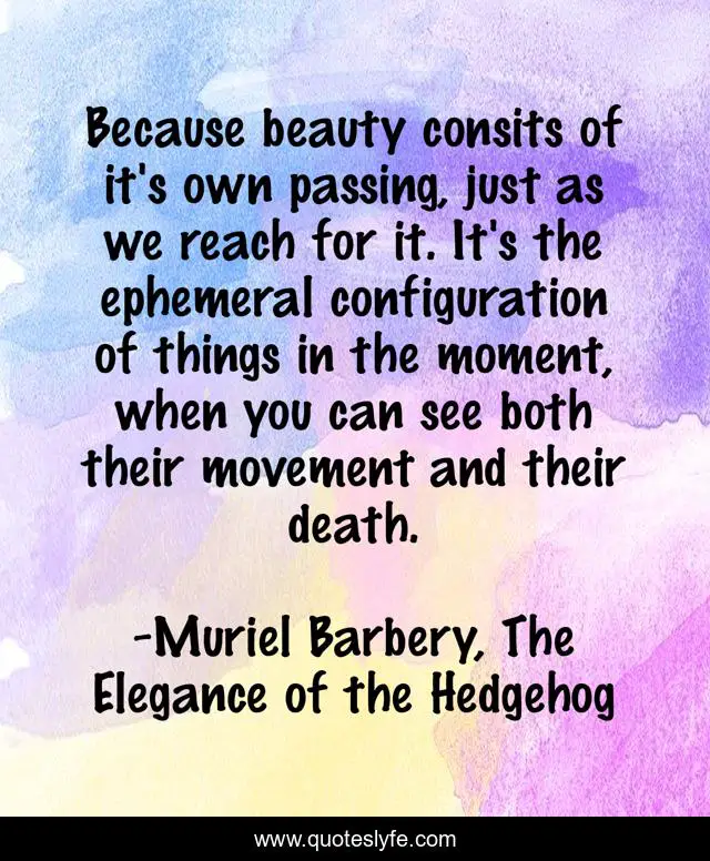 This page presents the quote "Because beauty consits of it's own passing, just as we reach for it. It's the ephemeral configuration of things in the moment, when you can see both their movement and their death.". Author of this quote is Muriel Barbery, The Elegance of the Hedgehog. This quote is about death, beauty, hedgehogs,.