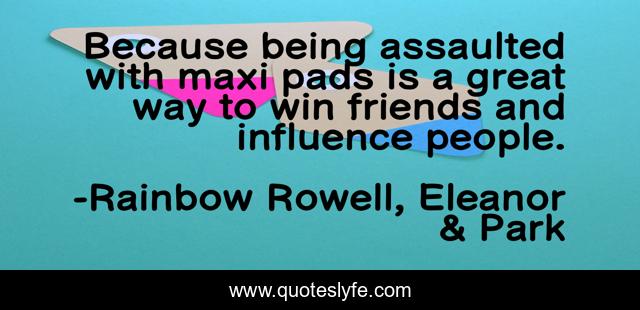 This page presents the quote "Because being assaulted with maxi pads is a great way to win friends and influence people.". Author of this quote is Rainbow Rowell, Eleanor & Park. This quote is about humor, young-adult,.