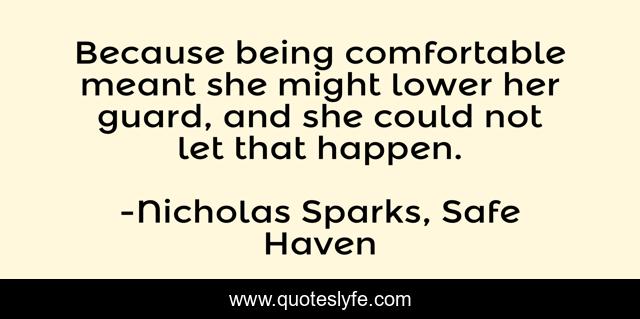 This page presents the quote "Because being comfortable meant she might lower her guard, and she could not let that happen.". Author of this quote is Nicholas Sparks, Safe Haven. .