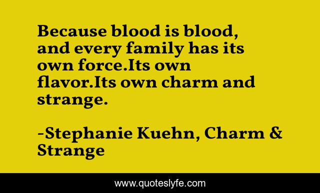 This page presents the quote "Because blood is blood, and every family has its own force.Its own flavor.Its own charm and strange.". Author of this quote is Stephanie Kuehn, Charm & Strange. This quote is about strange, charm, blood, family,.