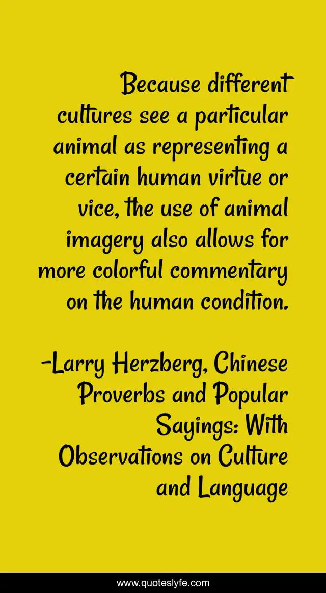 This page presents the quote "Because different cultures see a particular animal as representing a certain human virtue or vice, the use of animal imagery also allows for more colorful commentary on the human condition.". Author of this quote is Larry Herzberg, Chinese Proverbs and Popular Sayings: With Observations on Culture and Language. This quote is about sayings, chinese, language, proverbs, culture, china,.