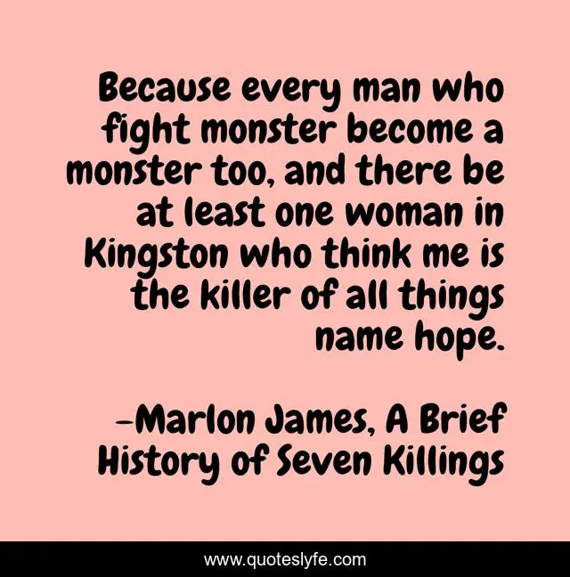 This page presents the quote "Because every man who fight monster become a monster too, and there be at least one woman in Kingston who think me is the killer of all things name hope.". Author of this quote is Marlon James, A Brief History of Seven Killings. .