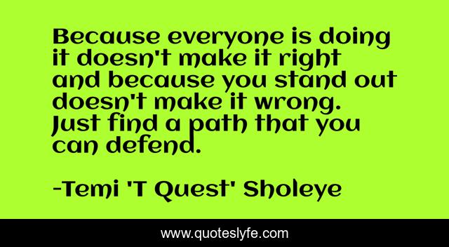 This page presents the quote "Because everyone is doing it doesn't make it right and because you stand out doesn't make it wrong. Just find a path that you can defend.". Author of this quote is Temi 'T Quest' Sholeye. This quote is about because, defend, wrong, everyone, right, path, stand-out,.