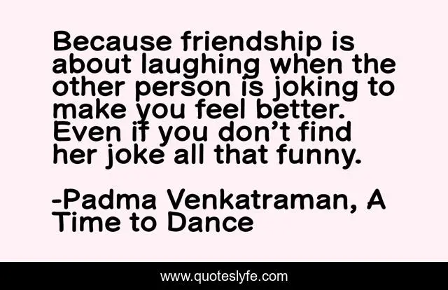 This page presents the quote "Because friendship is about laughing when the other person is joking to make you feel better. Even if you don’t find her joke all that funny.". Author of this quote is Padma Venkatraman, A Time to Dance. This quote is about relationships, friends, friendship,.