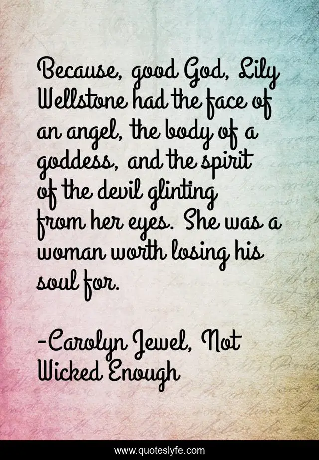 This page presents the quote "Because, good God, Lily Wellstone had the face of an angel, the body of a goddess, and the spirit of the devil glinting from her eyes. She was a woman worth losing his soul for.". Author of this quote is Carolyn Jewel, Not Wicked Enough. This quote is about goddess, devil, love, angel, soul, passion, affection,.