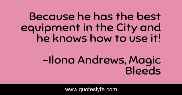 This page presents the quote "Because he has the best equipment in the City and he knows how to use it!". Author of this quote is Ilona Andrews, Magic Bleeds. This quote is about funny, comedy, humor, kate,.