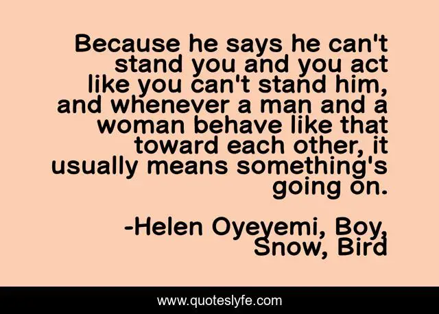 This page presents the quote "Because he says he can't stand you and you act like you can't stand him, and whenever a man and a woman behave like that toward each other, it usually means something's going on.". Author of this quote is Helen Oyeyemi, Boy, Snow, Bird. This quote is about woman, love, crush, lovers, affection, man,.