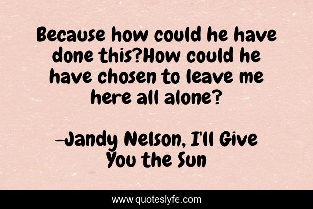 This page presents the quote "Because how could he have done this?How could he have chosen to leave me here all alone?". Author of this quote is Jandy Nelson, I'll Give You the Sun. This quote is about grief, loneliness, pain,.