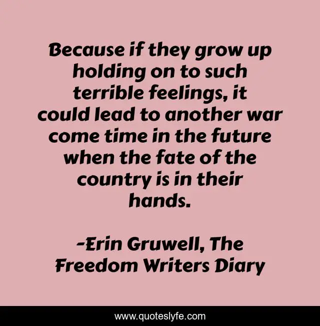 This page presents the quote "Because if they grow up holding on to such terrible feelings, it could lead to another war come time in the future when the fate of the country is in their hands.". Author of this quote is Erin Gruwell, The Freedom Writers Diary. This quote is about pain, future-leaders, generation, youth, future, negative-attitude, war, negativity,.