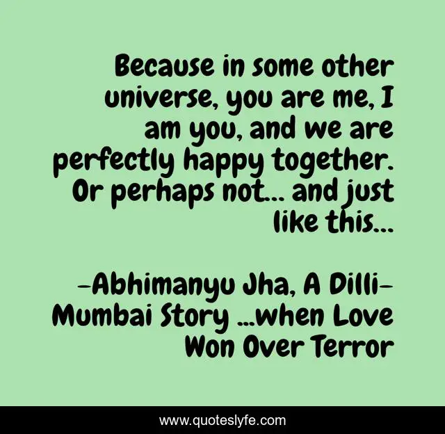 This page presents the quote "Because in some other universe, you are me, I am you, and we are perfectly happy together. Or perhaps not… and just like this…". Author of this quote is Abhimanyu Jha, A Dilli-Mumbai Story ...when Love Won Over Terror. This quote is about love, philosophy, romance, passion, remembrance, affection,.