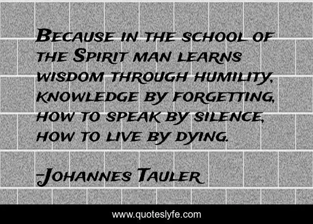 This page presents the quote "Because in the school of the Spirit man learns wisdom through humility, knowledge by forgetting, how to speak by silence, how to live by dying.". Author of this quote is Johannes Tauler. This quote is about school, knowledge, wisdom,.
