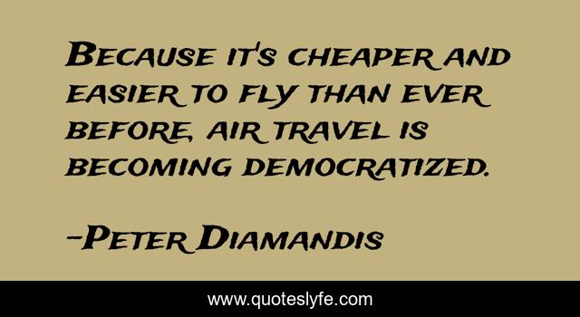This page presents the quote "Because it's cheaper and easier to fly than ever before, air travel is becoming democratized.". Author of this quote is Peter Diamandis. This quote is about fly, easier, air,.
