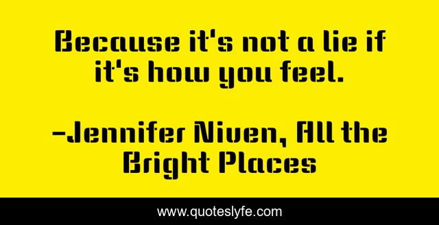 This page presents the quote "Because it's not a lie if it's how you feel.". Author of this quote is Jennifer Niven, All the Bright Places. This quote is about all-the-bright-places, feel, violet, finch, lie,.