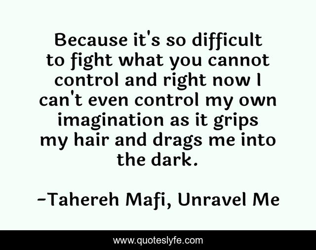 This page presents the quote "Because it's so difficult to fight what you cannot control and right now I can't even control my own imagination as it grips my hair and drags me into the dark.". Author of this quote is Tahereh Mafi, Unravel Me. This quote is about dark, imagination, juliette-ferrars,.