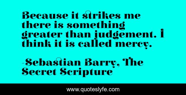 This page presents the quote "Because it strikes me there is something greater than judgement. I think it is called mercy.". Author of this quote is Sebastian Barry, The Secret Scripture. This quote is about judgement, mercy,.