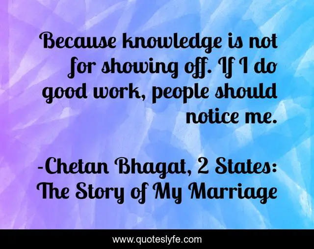 This page presents the quote "Because knowledge is not for showing off. If I do good work, people should notice me.". Author of this quote is Chetan Bhagat, 2 States: The Story of My Marriage. This quote is about school, knowledge, people, work, society, showing-off,.