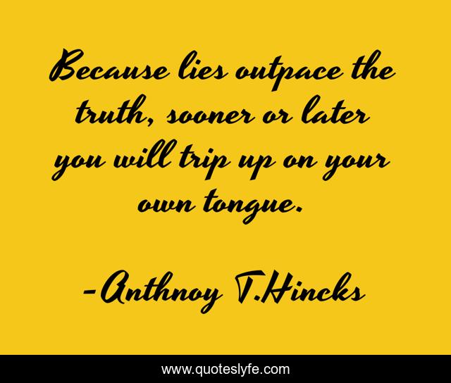 This page presents the quote "Because lies outpace the truth, sooner or later you will trip up on your own tongue.". Author of this quote is Anthnoy T.Hincks. This quote is about life, later, tip-up, philosophy, mask, sooner, lies, truth, tongue,.