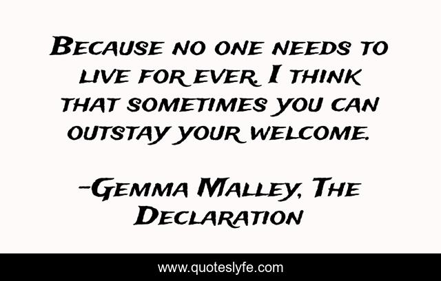 This page presents the quote "Because no one needs to live for ever. I think that sometimes you can outstay your welcome.". Author of this quote is Gemma Malley, The Declaration. This quote is about life, death, love, gemma, welcome, anna, declaration, peter, malley,.