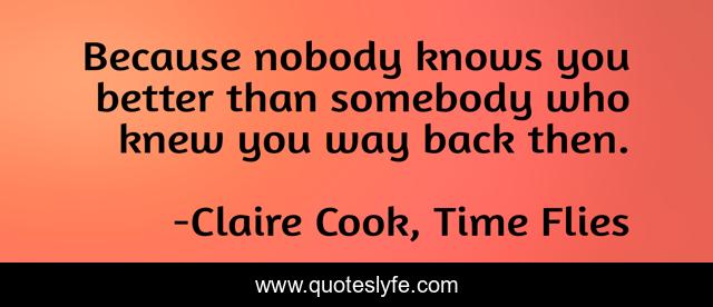 This page presents the quote "Because nobody knows you better than somebody who knew you way back then.". Author of this quote is Claire Cook, Time Flies. This quote is about reinvention, inspiration, friendship, nostalgia, midlife,.